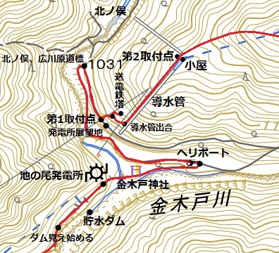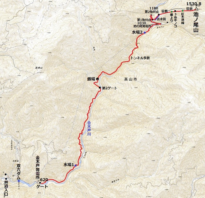 5:20 金木戸発電所(4:40)→(7:20)第1取付点(7:30)→(10:00)池ノ尾山