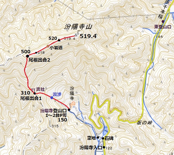 汾陽寺入口の直角カーブの所が登山口、道標は全くない。