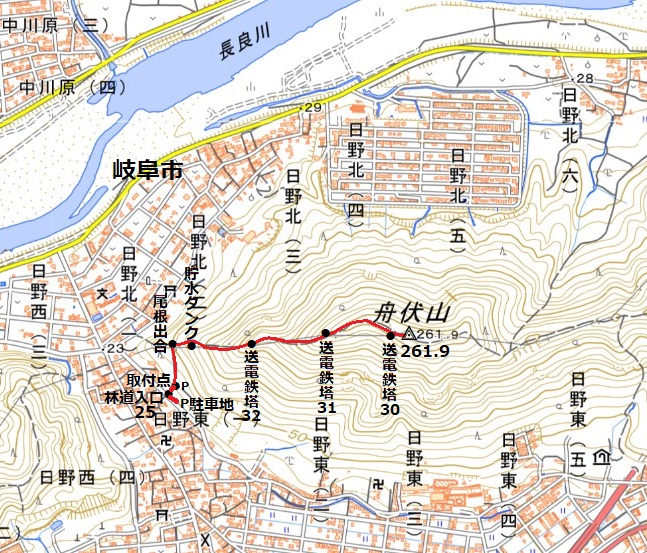 金華山の山塊を前方に、送電鉄塔NO32を下る。