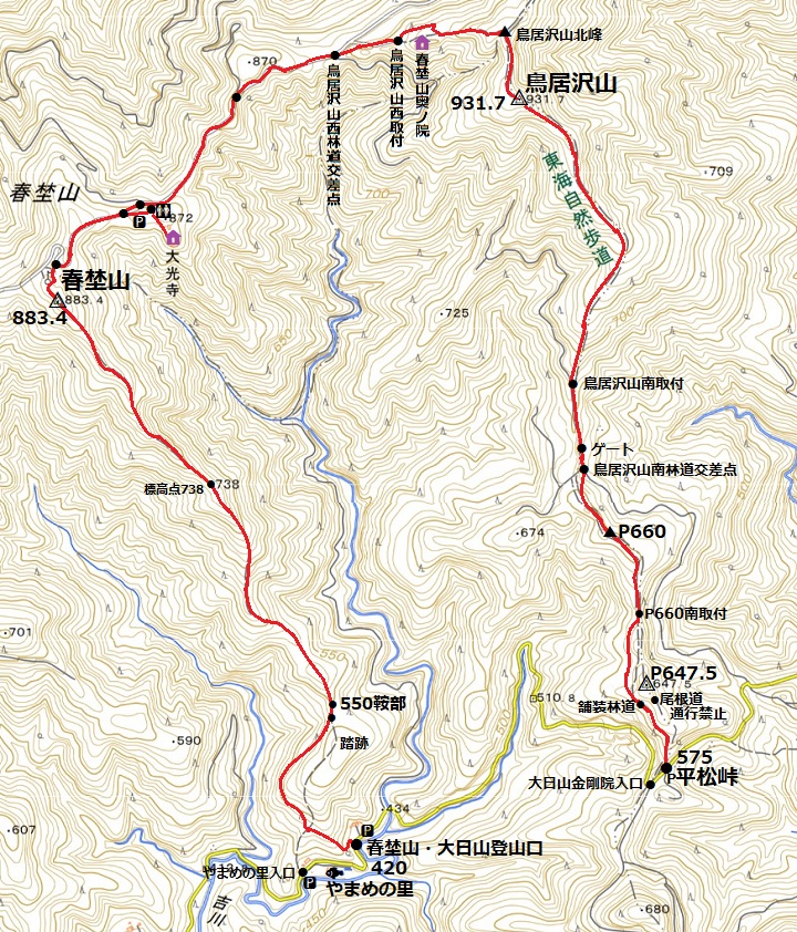 3:05 平松峠(8:30)→(10:35)鳥居沢山(10:40)→(11:35)大光寺